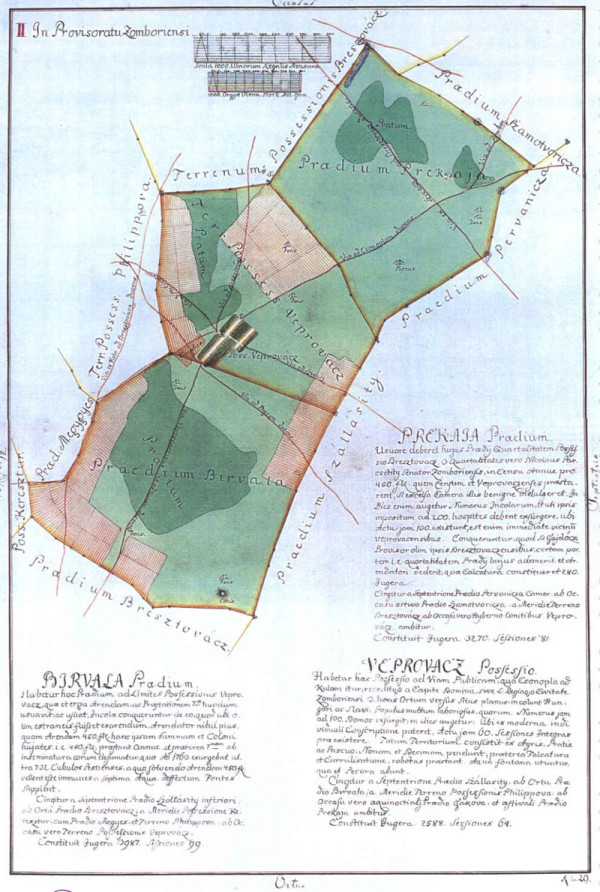 It lies next tot he public road which leads from Tschonoplja to Kula, at the „Head oft he Lord“, and tot he administration district of Zombor in which Hungarians and Slavonians live. Very busy people, whose number, which is at present 100 houses, grows day by day: it shows up in a modern individual census that already 60 sessions were opened up for existence. The whole territory consists of farmers, clerks and shepherds. They pay the 9th or 10th just like the contribution to falconry, the carriages and compulsory labor. They used the spring-water as well as the pasture-land. It is parted from the North by the Praedium Szalasity; from the East it is separated by the Praedium Buwala; from the South it is parted by the area oft he property Phillipowa, from the North-West by the area of Gakowa and the Praedium Prekaja.