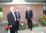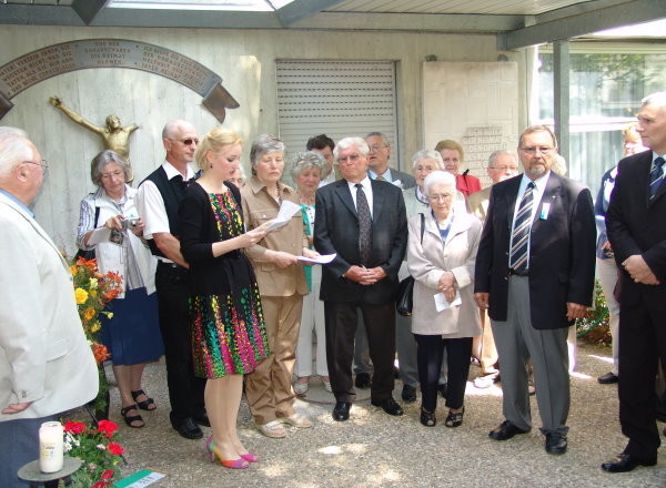 Anschließend ging es nach draußen auf den Ehrenhof, dem großen symbolischen donauschwäbischen Zentralfriedhof für alle Toten, besonders aber für jene, die keine würdige Ruhestätte gefunden haben. Und wie jedes Jahr wurde eine schöne Blumenschale vor die Gedenktafel gestellt. Die Gäste aus Serbien hatten einen Kranz mitgebracht, der ebenfalls niedergelegt wurde. Barbara Büttner sprach Gedenkworte, Elfriede Seiler las die Fürbitten und alle Besucher sangen zwei Strophen des Liedes „Großer Gott wir loben dich".