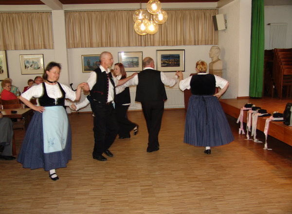 Vor dem Mittagessen wurden wieder auf der Treppe vor dem Haus Gruppenfotos gemacht. Gleich nach dem Mittagessen führte Hans Supritz die Gäste durch das Haus der Donauschwaben. Selbstgebackene Kuchen und Torten waren reichlich vorhanden, die am Nachmittag zum Kaffee serviert wurden. Gegen 15 Uhr führte die donauschwäbische Tanz- und Trachtengruppe Backnang mehrere Tänze auf, was guten Anklang fand. Mit angeregten Unterhaltungen verging rasch die Zeit. Bei der Verabschiedung hörte man: „Alles Gute bis zum nächsten Jahr".