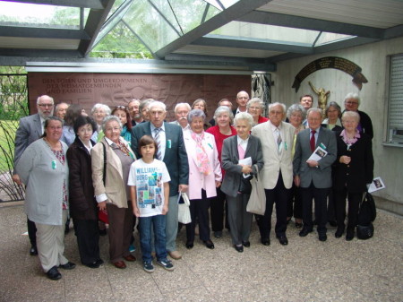 Anschließend fand das Totengedenken im Ehrenhof, dem großen symbolischen donauschwäbischen Zentralfriedhof für alle Toten, besonders aber für jene, die keine würdige Ruhestätte gefunden haben, statt. Manfred Kessler und Günther Weißbarth stellten eine schöne Blumenschale vor der Gedenktafel nieder. Gleichzeitig wurde das Glockengeläut der Kirche von Weprowatz von einem Tonträger abgespielt. Frau Mojem sprach Gedenkworte und Gebete. Mit dem gemeinsamen Lied „Großer Gott wir loben dich" endete die Feier.