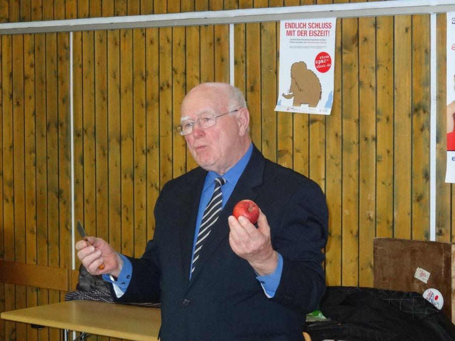 Richard Harle teilte mit einem Ulaker – einem einfachen bunden Taschenmesser aus der alten Heimat – einen Apfel, der neben dem Fruchtfleisch den wichtigen Inhalt Kerne beherberge, die Bezug zu Wurzel, Stamm und Früchte des Apfelbaumes haben. Ein Auszug aus seinem Vortrag: